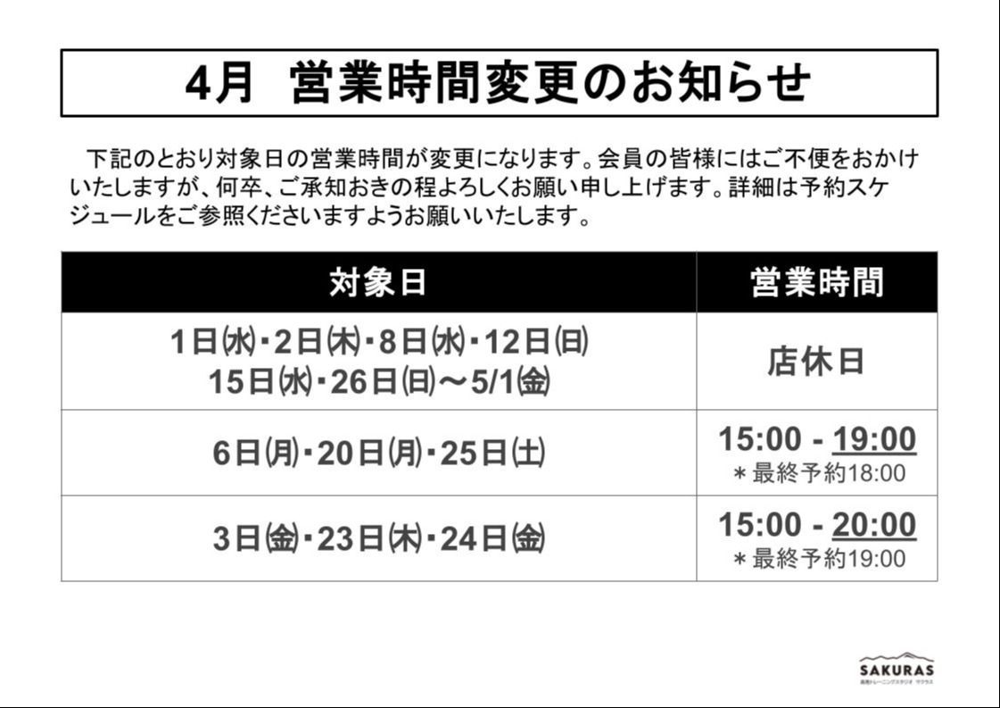 4月の店休日ならびに営業時間変更日をお知らせいたします。4/26㈰~5/1㈮までは連休を頂戴いたします。会員の皆様にはご不便をおかけいたしますが、何卒、ご承知おきの上でご予約・ご利用をお願い申し上げます。詳細は「会員マイページ」➡「予約」タブからも合わせてご確認くださいますようお願いいたします。